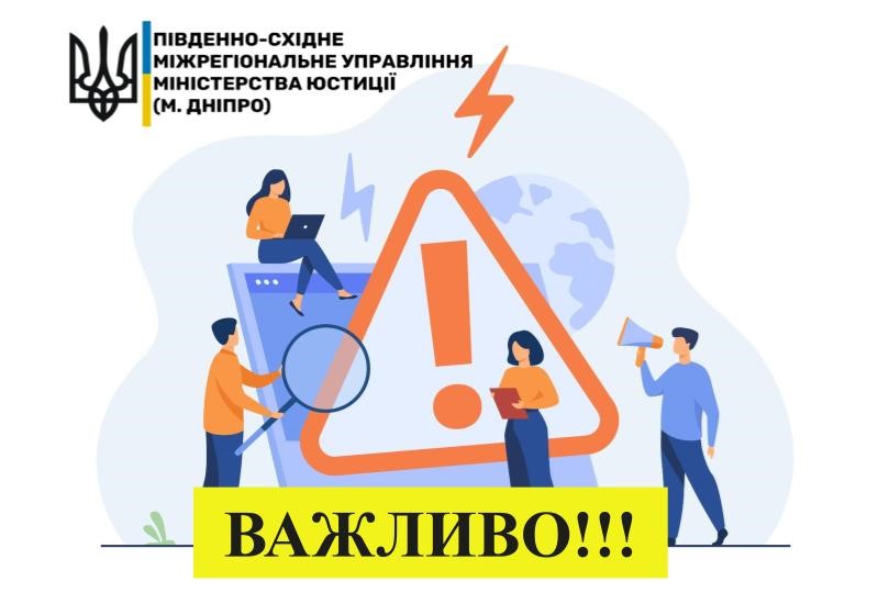 Оскільки на території України відсьогодні офіційно введено воєнний стан, Південно-Східне міжрегіональне управління Міністерства юстиції (м.Дніпро) працює згідно вимог законодавства. Водночас, звертаємо Вашу увагу, що на офіційному сайті міжрегіонального управління знаходиться актуальна інформація щодо контактних телефоних номерів всіх структурних підрозділів за посиланням⏩ http://shortest.link/3g5U