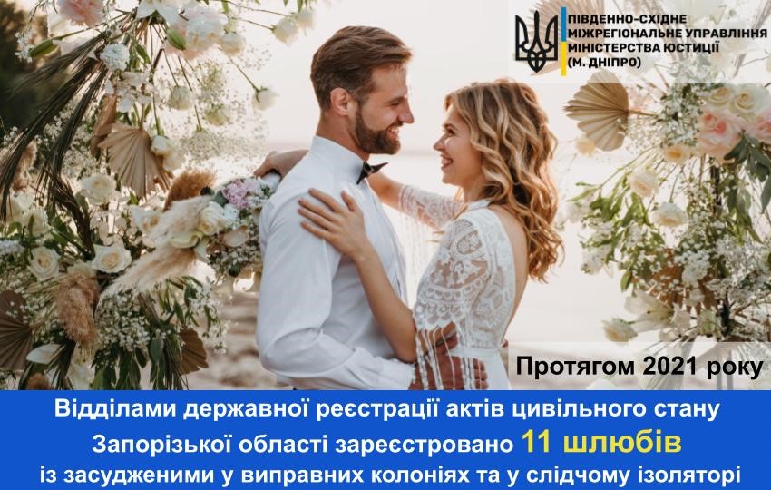 Так, протягом 2021 року відділами державної реєстрації актів цивільного стану Запорізької області зареєстровано 11 шлюбів із засудженими у виправних колоніях та у слідчому ізоляторі.