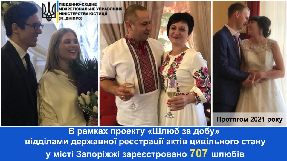 В рамках проєкту відділами державної реєстрації актів цивільного стану у місті Запоріжжі протягом 2021 року зареєстровано 707 шлюбів