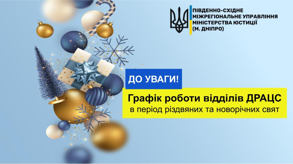 ❗️ У зв’язку зі святкуванням Різдва Христового (25 грудня та 7 січня), а також Нового року (1 січня) відділи ДРАЦС Південно-Східного міжрегіонального управління Міністерства юстиції (м. Дніпро) працюють за графіком із наступними вихідними днями.