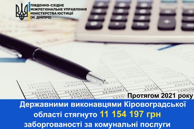 ? Питання заборгованості по сплаті комунальних послуг наразі є досить актуальним. Так, протягом 2021 року державними виконавцями Кіровоградської області стягнуто 11 154 197 грн заборгованості за комунальні послуги.