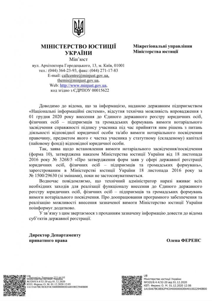 ?? До відома та врахування в роботі державних реєстраторів ? лист Міністерства юстиції України від 01.12.2020 № 320/8.4.8/32-20 щодо ??технічної можливості опрацювання в Єдиному державному реєстрі юридичних осіб, фізичних осіб-підприємців та громадських формувань нової форми ? заяви щодо встановлення вимоги ✍️нотаріального засвідчення/посвідчення (форма 10).