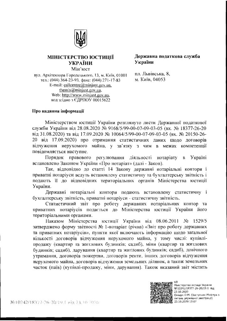 До уваги представників нотаріальної спільноти ?лист Міністерства юстиції України від 23 жовтня 2020 року №10242/18377-26-20/19.1 щодо розгляду листів Державної податкової служби України про отримання статистичних даних щодо договорів відчуження нерухомого майна ⤵️