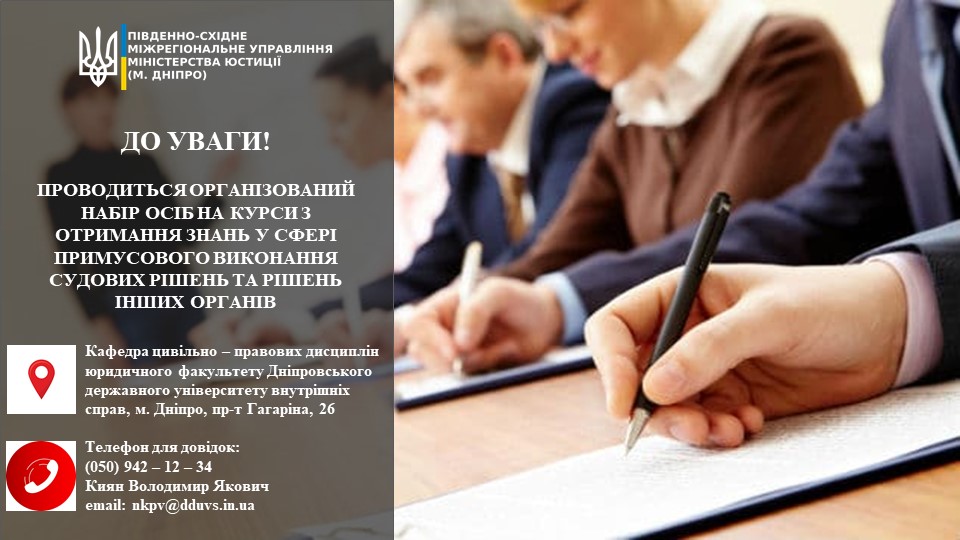 Юридичний факультет Дніпровського державного університету внутрішніх справ оголошує прийом заяв від осіб, які мають намір здійснювати діяльність приватного виконавця судових рішень та рішень інших органів (далі – курси) з видачею свідоцтва про проходження навчання.