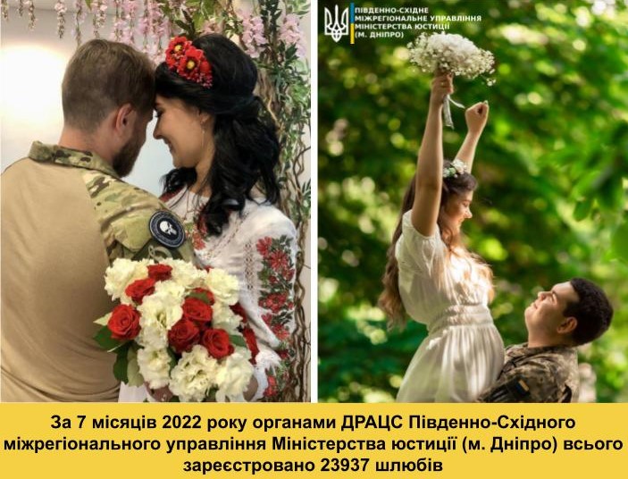 За 7 місяців 2022 року органами ДРАЦС Південно-Східного міжрегіонального управління Міністерства юстиції (м. Дніпро) всього зареєстровано ?23937 шлюбів: