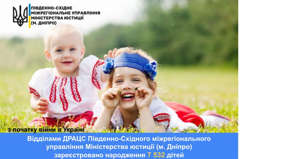 З моменту початку війни росії проти України органами ДРАЦС Південно-Східного міжрегіонального управління Міністерства юстиції (м. Дніпро) зареєстровано народження 7532 дітей, з них: