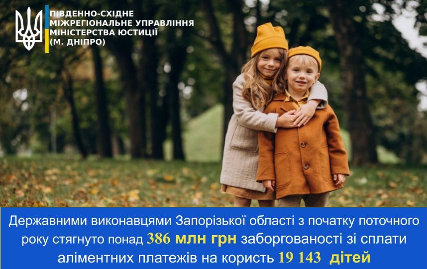 З початку 2021 року державними виконавцями Запорізької області стягнуто понад 386 млн. грн аліментів на користь 19 143 дітей