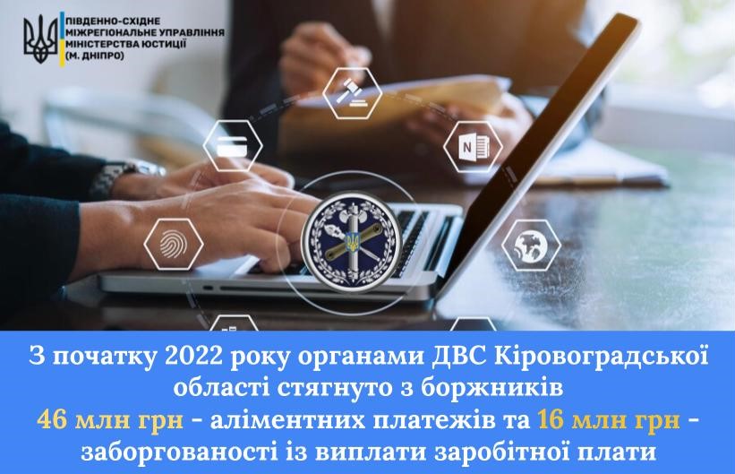 З початку 2022 року органами ДВС Кіровоградської області стягнуто з боржників 46 млн грн — аліментних платежів та 16 млн грн — заборгованості із виплати заробітної плати