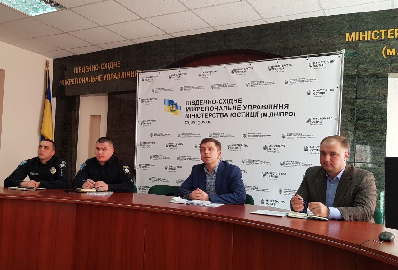 З метою налагодження ефективної взаємодії органів держаної виконавчої служби з патрульною поліцією Дніпропетровської області, в приміщенні Південно-Східного міжрегіонального управління Міністерства юстиції відбулась нарада під головуванням заступника начальника Південно-Східного міжрегіонального управління Міністерства юстиції – начальника Управління забезпечення примусового виконання рішень у Дніпропетровській області Південно-Східного міжрегіонального управління Міністерства юстиції (м. Дніпро) Олександра Більчука.