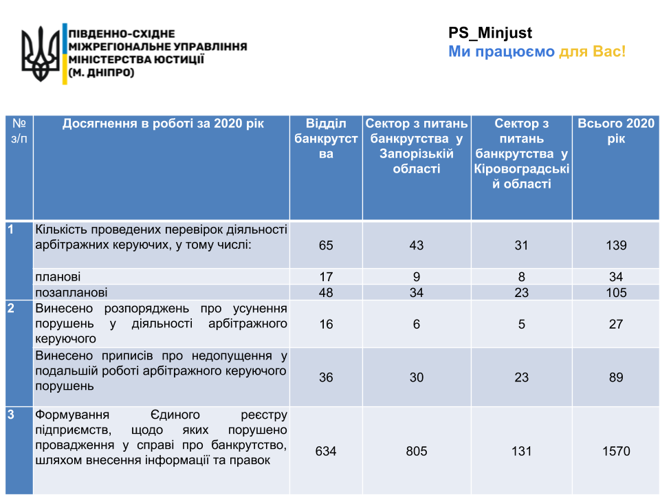 ? ?Результати роботи за 2️⃣0️⃣2️⃣0️⃣ рік відділу банкрутства Південно-Східного міжрегіонального управління Міністерства юстиції (м. Дніпро) ⤵️