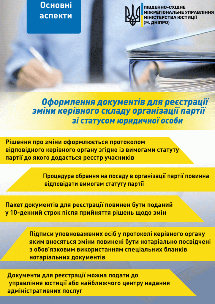 Особливості оформлення документів для реєстрації зміни керівного складу організації партії зі статусом юридичної особи