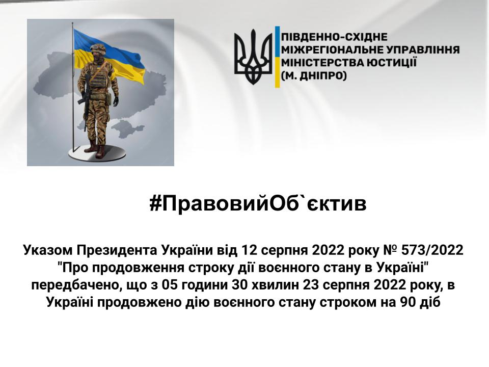 Відсьогодні, Указом Президента України від 12 серпня 2022 року № 573/2022 передбачено, що з 05 години 30 хвилин, в Україні продовжено дію воєнного стану строком на 90 діб — до 21 листопада 2022 року.
