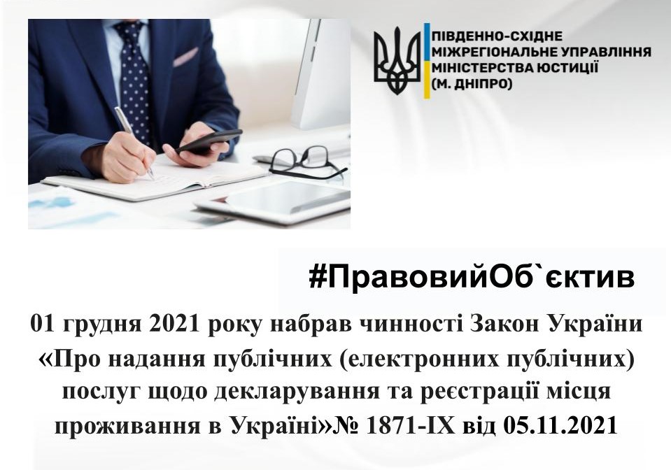 #Правовий_Обєктив: 01 грудня 2021 року набрав чинності Закон України «Про надання публічних (електронних публічних) послуг щодо декларування та реєстрації місця проживання в Україні»№ 1871-IX від 05.11.2021