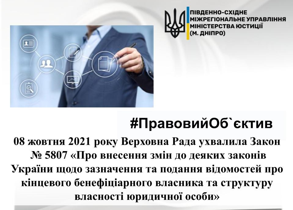 ? 08 жовтня 2021 року прийнято Закон про внесення змін до деяких законів України щодо зазначення та подання відомостей про кінцевого бенефіціарного власника та структуру власності юридичної особи (законопроєкт № 5807).