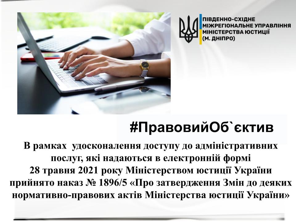 В рамках вдосконалення доступу до адміністративних послуг, які надаються в електронній формі 28 травня 2021 року Міністерством юстиції України прийнято наказ № 1896/5 «Про затвердження Змін до деяких нормативно-правових актів Міністерства юстиції України»(далі — Наказ).