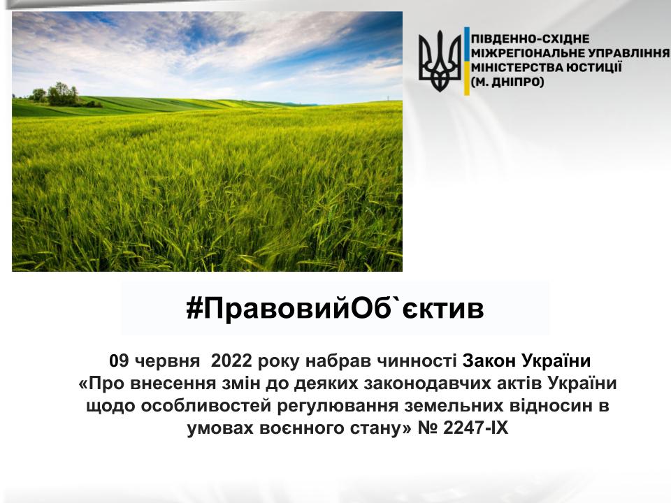#Правовий_Обєктив: 9 червня 2022 року набрав чинності Закон України «Про внесення змін до деяких законодавчих актів України щодо особливостей регулювання земельних відносин в умовах воєнного стану» № 2247-IX