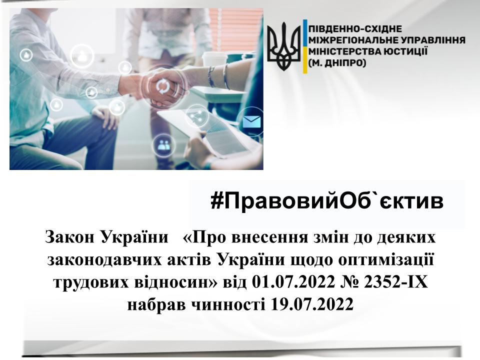 #Правовий_Обєктив:19 липня 2022 року набрав чинності Закон України   «Про внесення змін до деяких законодавчих актів України щодо оптимізації трудових відносин» від 01.07.2022 № 2352-ІХ.