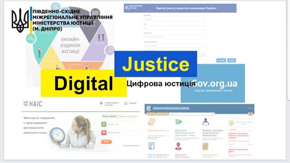 Проєкт «Digital Justice:Цифрова юстиція», який впроваджується за для інформування абітурієнтів, студентів, громадськості та усіх бажаючих з повноваженнями органів юстиції та цифровими онлайн сервісами, було презентовано першим заступником начальника Південно-Східного міжрегіонального управління юстиції (м. Дніпро) Ольгою Захаровою, яка зазначила, що створюючи умови та запроваджуючи такі інформаційні проєкти, як «Digital Justice» державні послуги в онлайн режимі будуть зрозумілими та зручними, а отже наближеними до громадян!