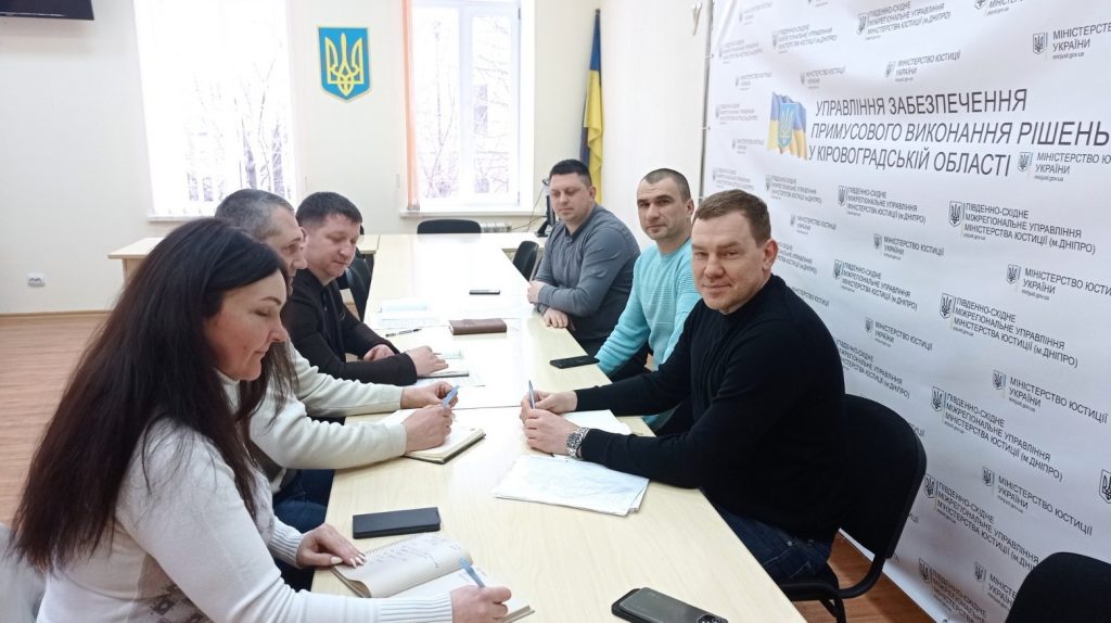 Сьогодні, 22 лютого 2022 року, проведено спільну нараду за участю начальника Управління забезпечення примусового виконання рішень у Кіровоградській області Південно-Східного міжрегіонального управління Міністерства юстиції (м. Дніпро) Дмитра ГОРБАТЮКА, представника Кіровоградської філії ДП «СЕТАМ» Віктора МОСКОВЦЯ, а також представників Кропивницької митниці Державної митної служби України Андрія ПРОЦЕНКА та Миколи ЦАРЕНКА.
