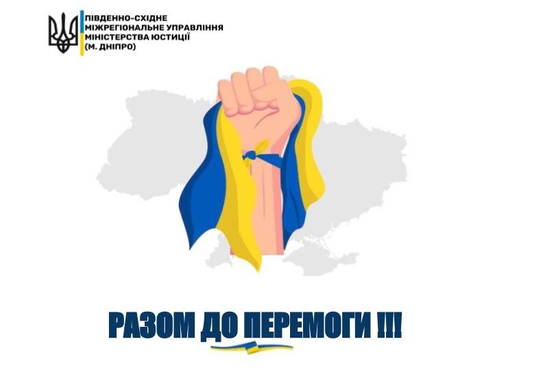Південно-Східне міжрегіональне управління Міністерства юстиції (м. Дніпро) не припиняло свою діяльність з 24 лютого 2022 року в Дніпропетровській, Запорізькій та Кіровоградській областях. Так, не дивлячись на загальний воєнний стан в державі ми робимо все можливе аби в кожному дні своєї діяльності підкреслити — людина та сфера сучасних і якісних послуг для громадян — пріоритет незалежної держави. Кожен працівник міжрегіонального управління керується у своїй роботі принципами відповідальності, доброчесності, професіоналізму та результативності, котрі наближають всіх нас до перемоги.