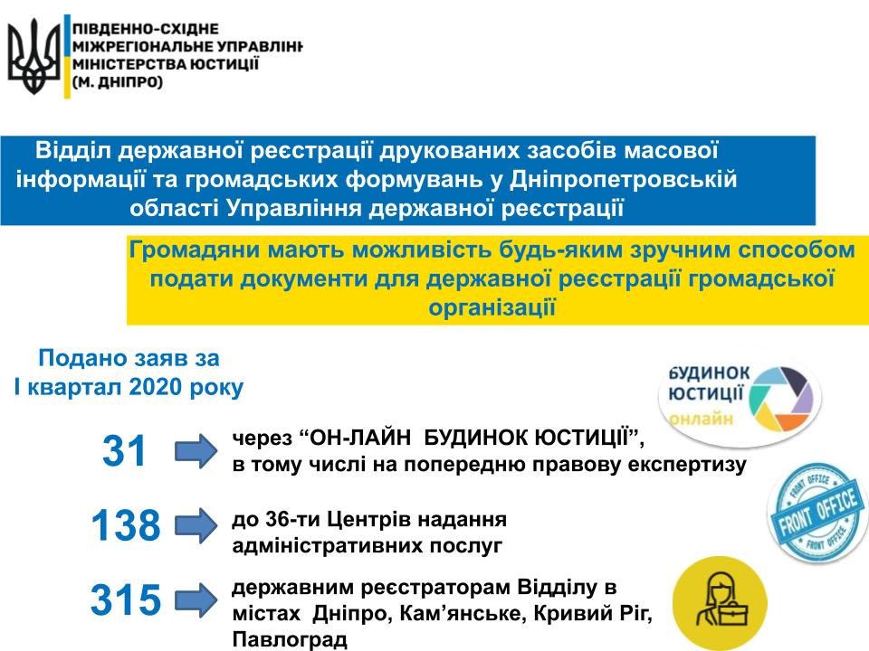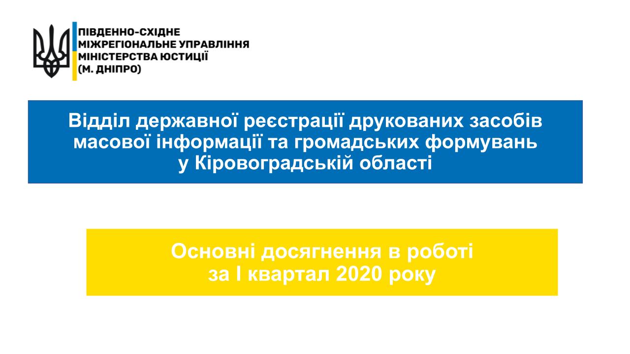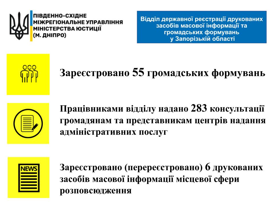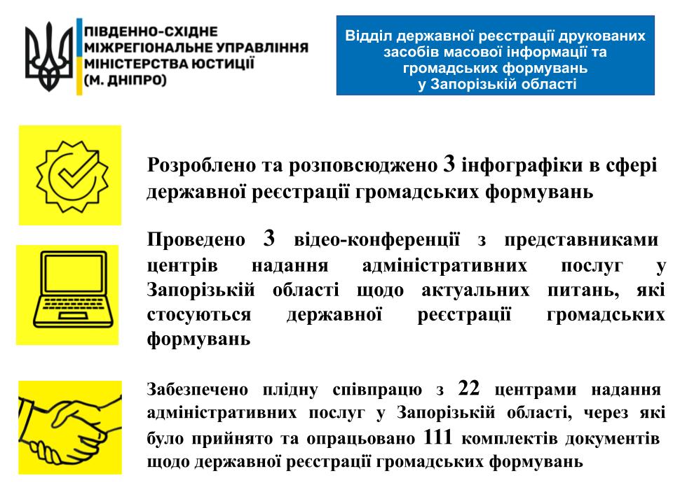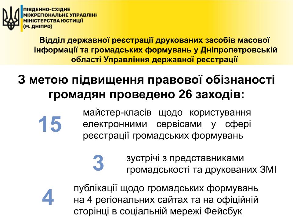 Результати роботи з напрямку реєстрації громадських об`єднань та засобів масової інформації у Дніпропетровській, Запорізькій і Кіровоградській областях
