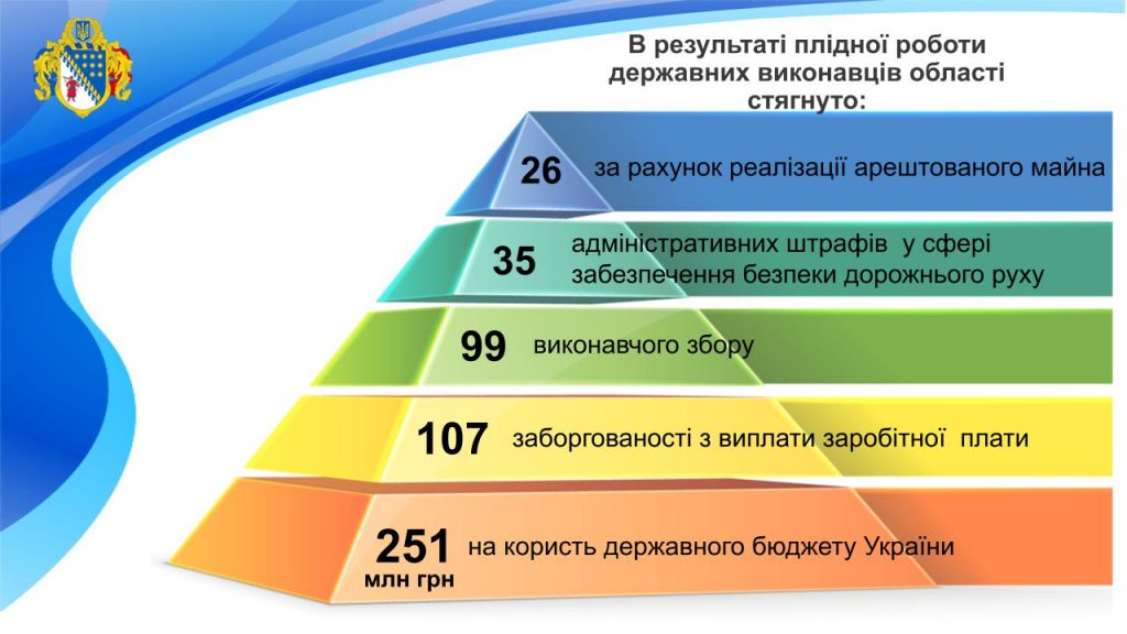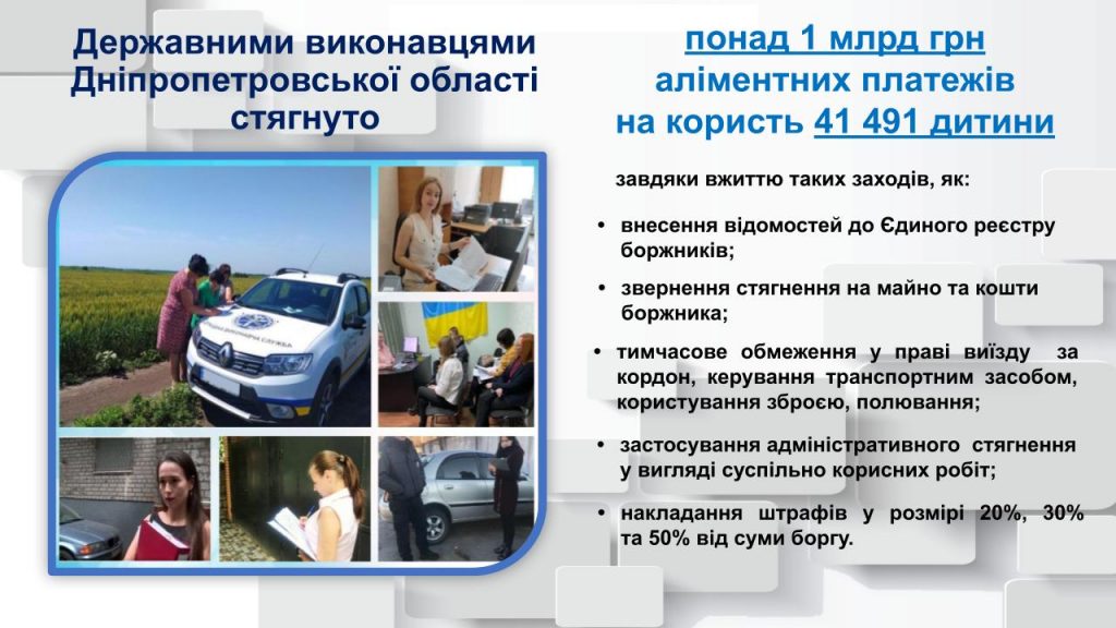 Завдяки роботі органів державної виконавчої служби Дніпропетровської області, підприємства боржники погасили мільйоні борги по заробітній платі перед своїми працівниками, недобросовісні батьки згадали про утримання своїх дітей, сплативши аліменти, а також виконано тисячі рішень майнового та немайнового характеру, зокрема щодо поновлення на роботі, встановлення побачення з дитиною, вселення або виселення.