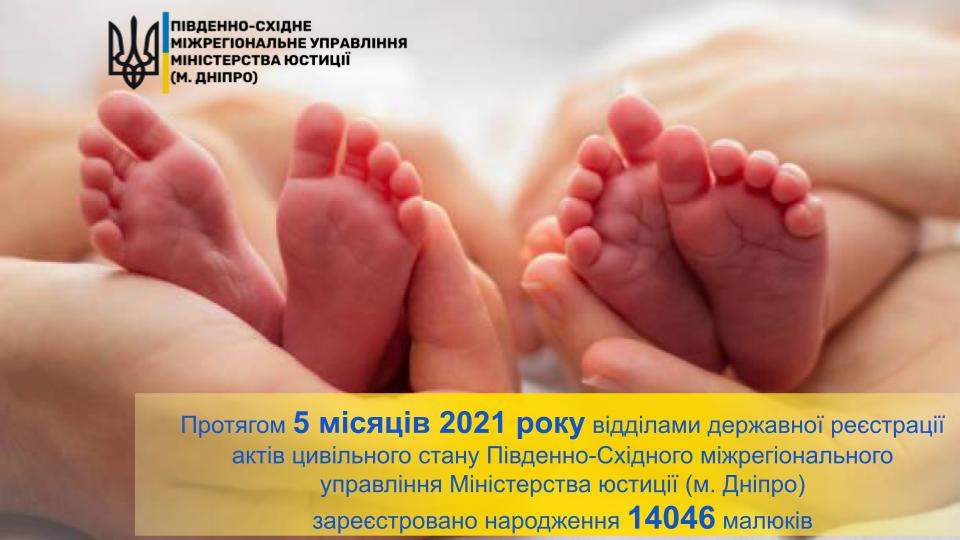 Протягом 5️⃣ місяців 2021 року відділами державної реєстрації актів цивільного стану Південно-Східного міжрегіонального управління Міністерства юстиції (м. Дніпро) зареєстровано народження 1️⃣4️⃣0️⃣4️⃣6️⃣ малюків, з них: