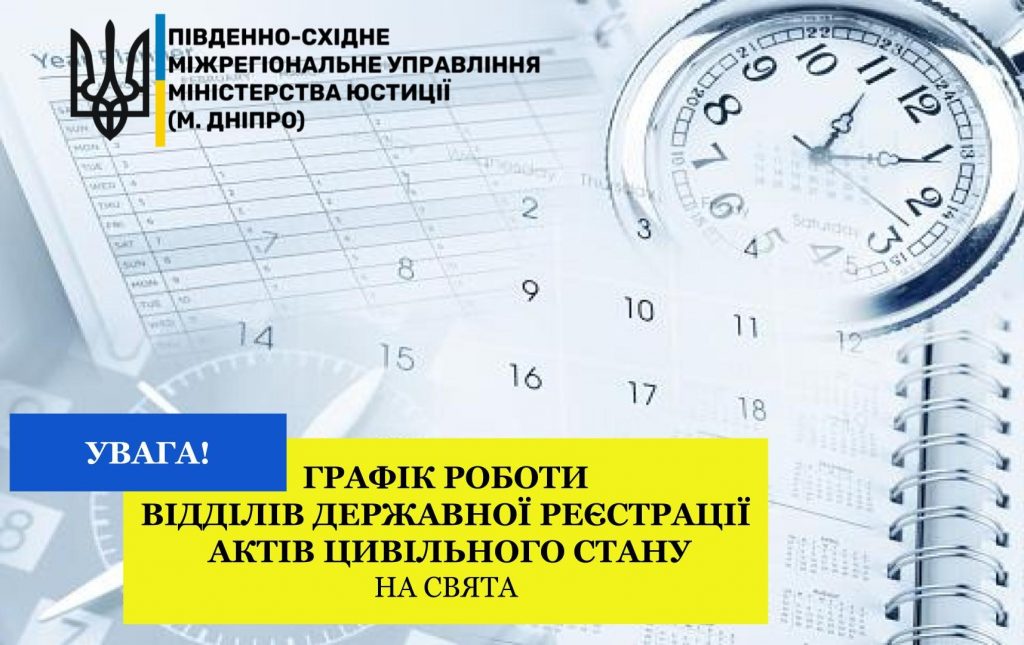 ? Нагадуємо про традиційні зміни у графіках роботи відділів державної реєстрації актів цивільного стану Дніпропетровської, Запорізької та Кіровоградської областей Південно-Східного міжрегіонального управління Міністерства юстиції (м. Дніпро).
