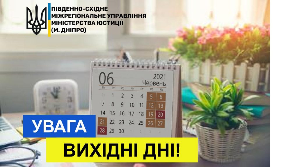 ℹ️ У зв’язку зі святкуванням Трійці (20 червня) та ??Дня Конституції України (28 червня) відділи ДРАЦС Південно-Східного міжрегіонального управління Міністерства юстиції (м. Дніпро) працюють за графіком із наступними вихідними днями.