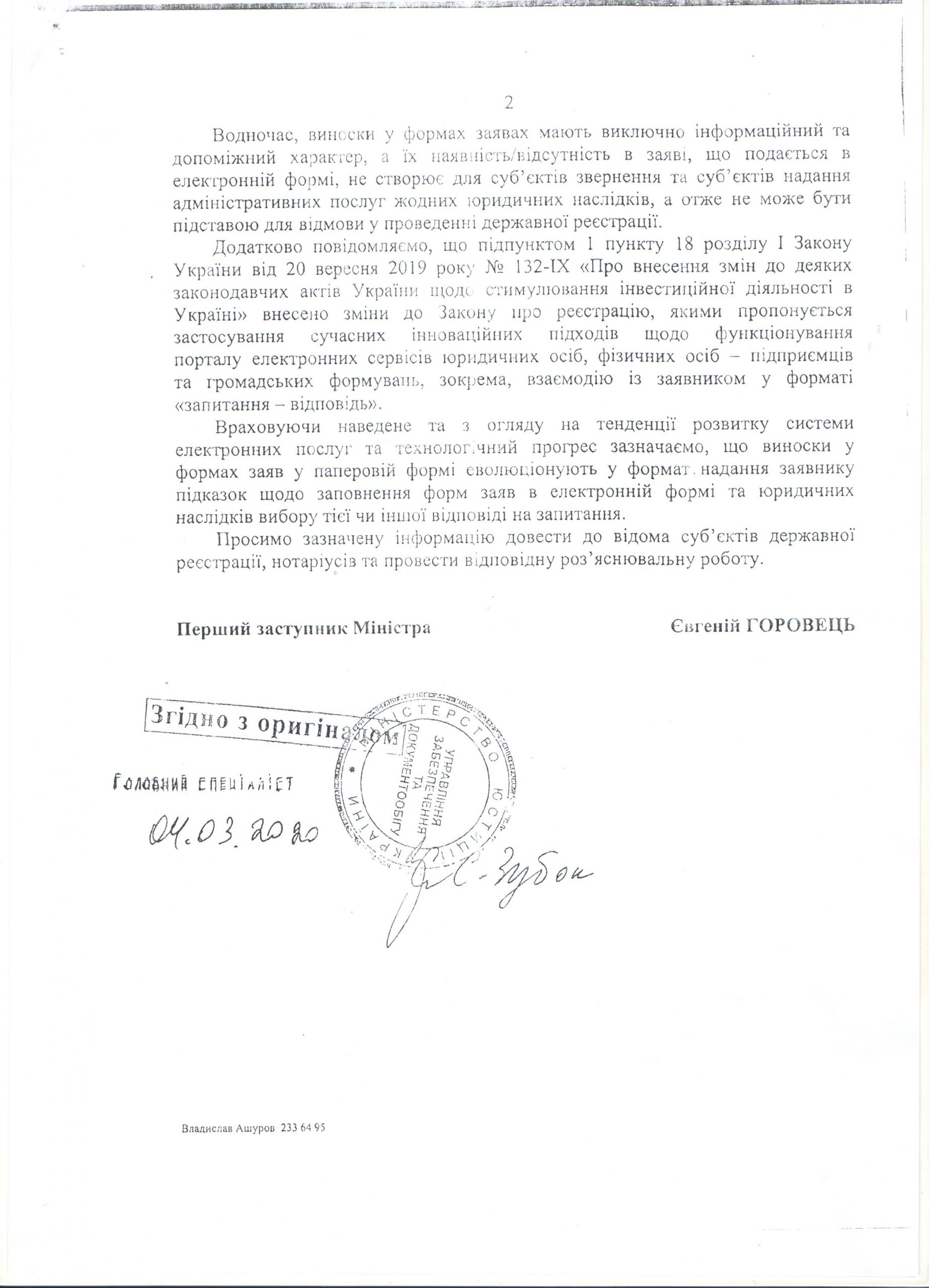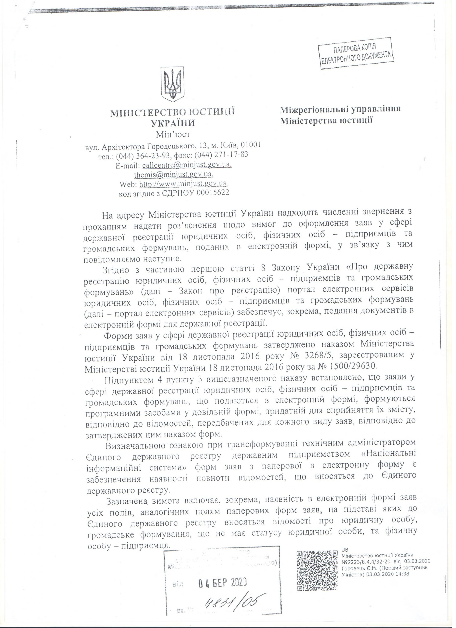 Увага! Інформуємо, що листом Міністерства юстиції України від 03.03.2020 № 2223/8.4.4/32-20 надано роз’яснення щодо вимог до оформлення заяв у сфері державної реєстрації юридичних осіб, фізичних осіб-підприємців та громадських формувань, поданих в електронній формі.