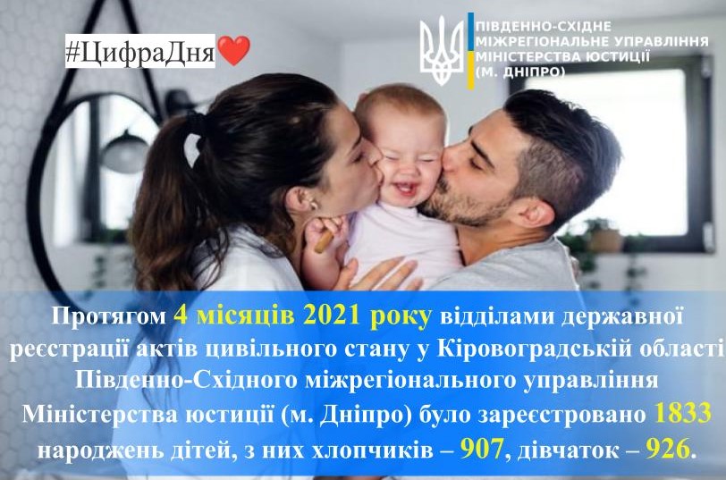 Так, у Кіровоградській області протягом 4️⃣місяців 2021 року органами державної реєстрації актів цивільного стану зареєстровано: 1833 народжень ?дітей, з них хлопчиків – 907, дівчаток – 926.