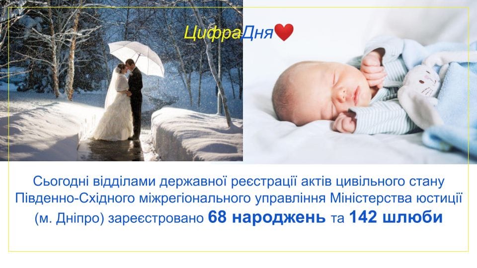 ? І знову щаслива статистика!? Сьогодні, у красиву, по-справжньому ❄️ зимову дату ? 12.12.2020 відділами ДРАЦС Південно-Східного міжрегіонального управління Міністерства юстиції (м. Дніпро) зареєстровано⤵️