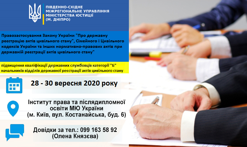 З 28 по 30 вересня 2020 року на базі Інституту права та післядипломної освіти Міністерства юстиції України відбудеться курс з підвищення кваліфікації державних службовців категорії «Б» — начальників відділів державної реєстрації актів цивільного стану Управлінь державної реєстрації міжрегіональних управлінь Міністерства юстиції за темою «Правозастосування Закону України «Про державну реєстрацію актів цивільного стану», Сімейного і Цивільного кодексів України та інших нормативно-правових актів при державній реєстрації актів цивільного стану».