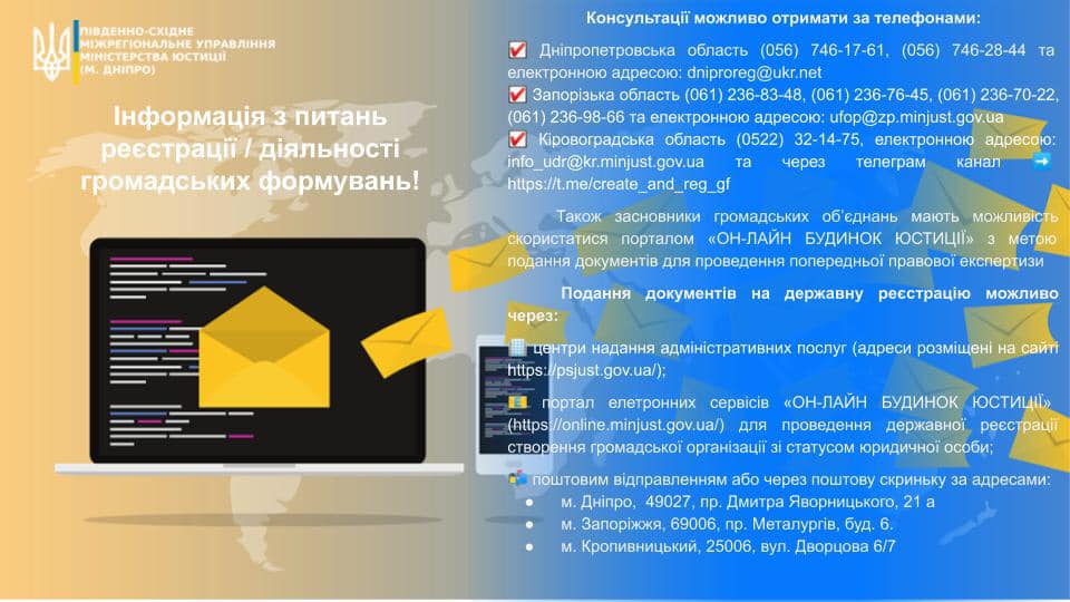Відповіді на Ваші питання у сфері реєстрації / діяльності громадських формувань Дніпропетровської, Запорізької, Кіровоградської областей, Ви можете отримати за допомогою телефонного та інтернет зв’язку. Всі контакти для Вас тут?