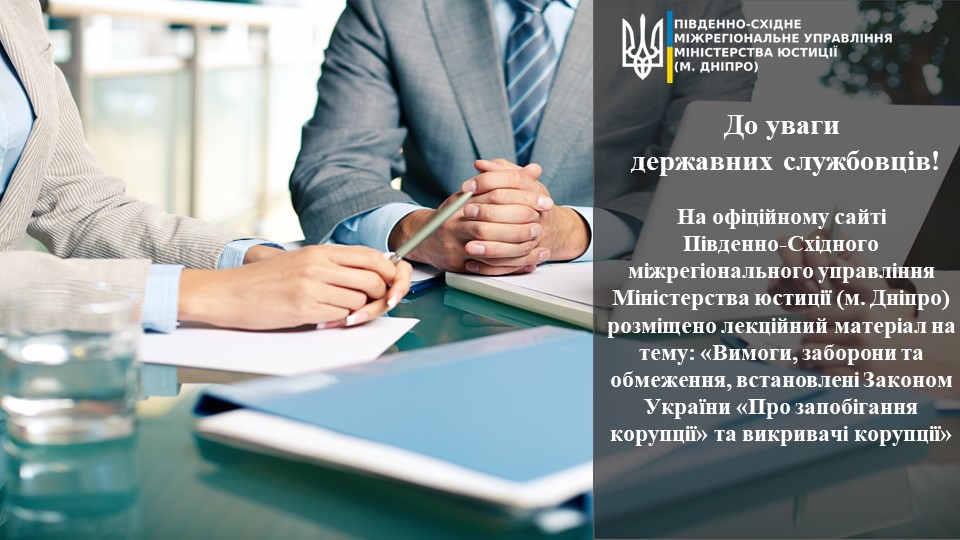 ? Звертаємо Вашу увагу, що на офіційному сайті Південно-Східного міжрегіонального управління Міністерства юстиції (м. Дніпро) розміщено лекційний матеріал з питань антикорупційного законодавства на тему ➡️ «Вимоги, заборони та обмеження, встановлені Законом України «Про запобігання корупції» та викривачі корупції».