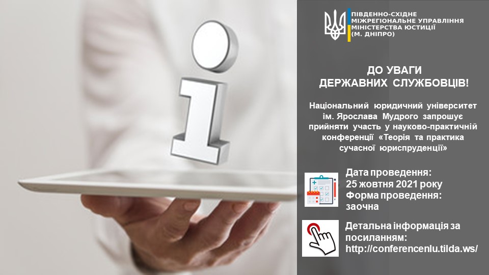 Національний юридичний університет ім. Ярослава Мудрого запрошує прийняти участь у науково-практичній конференції «Теорія та практика сучасної юриспруденції», що відбудеться 25 жовтня 2021 року в заочній формі, на платній основі.