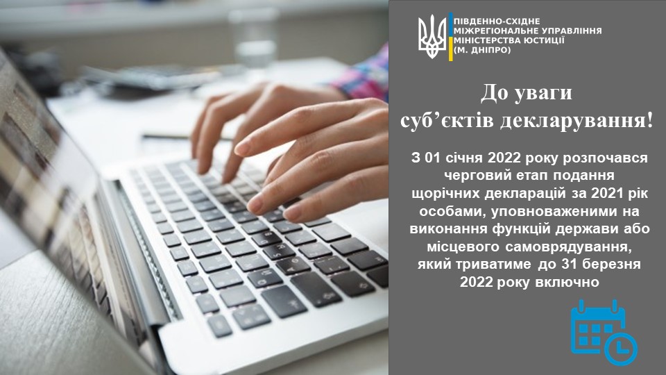 ? Інформуємо, що з 01 січня 2022 року розпочався черговий етап подання щорічних декларацій за 2021 рік особами, уповноваженими на виконання функцій держави або місцевого самоврядування, який триватиме до 31 березня 2022 року включно.