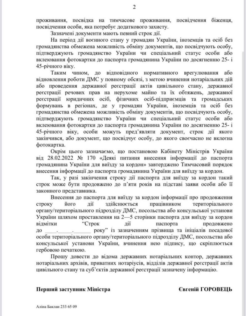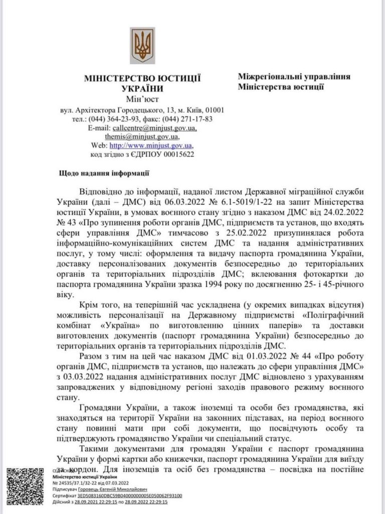 ? Лист Міністерства юстиції України від 07.03.2022 № 24535/37.1/32-22 щодо роботи інформаційно — комунікаційної системи ДМС та надання адміністративних послуг в умовах воєнного стану.
