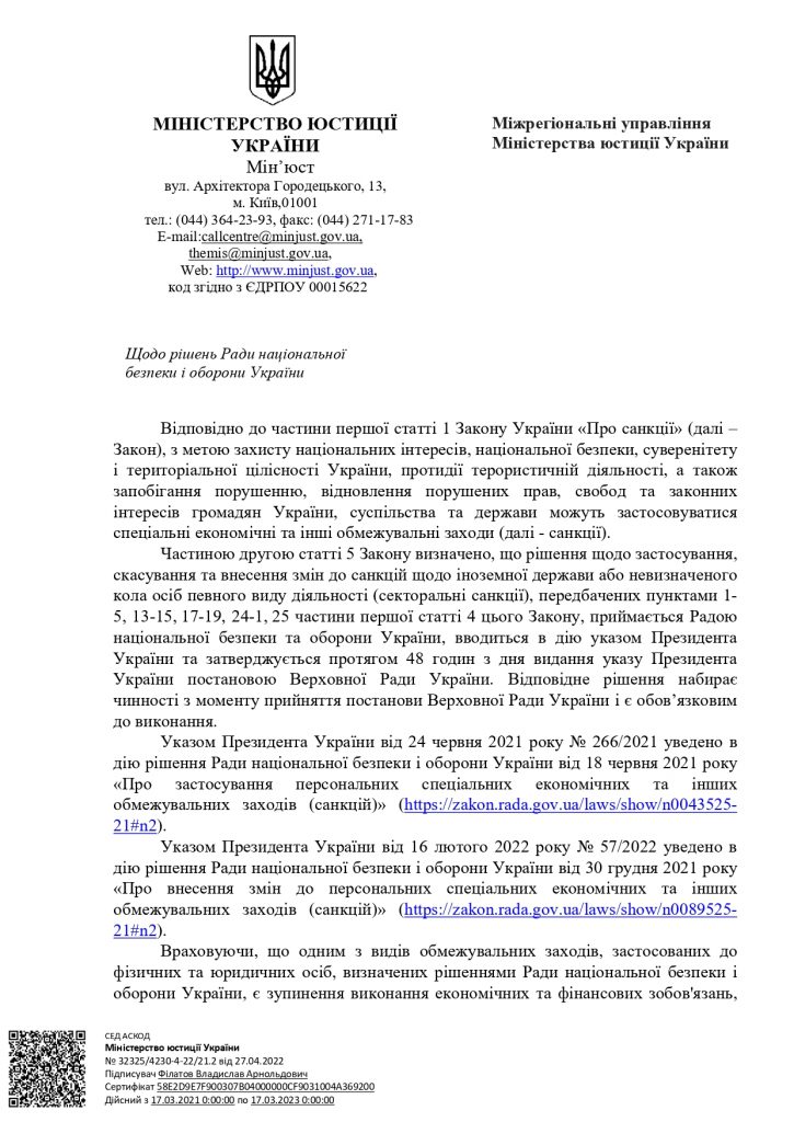 ? Лист Міністерства юстиції України від 27 квітня 2022 року №32325/4230-4-22/21.2 щодо рішень Ради національної безпеки і оборони України.