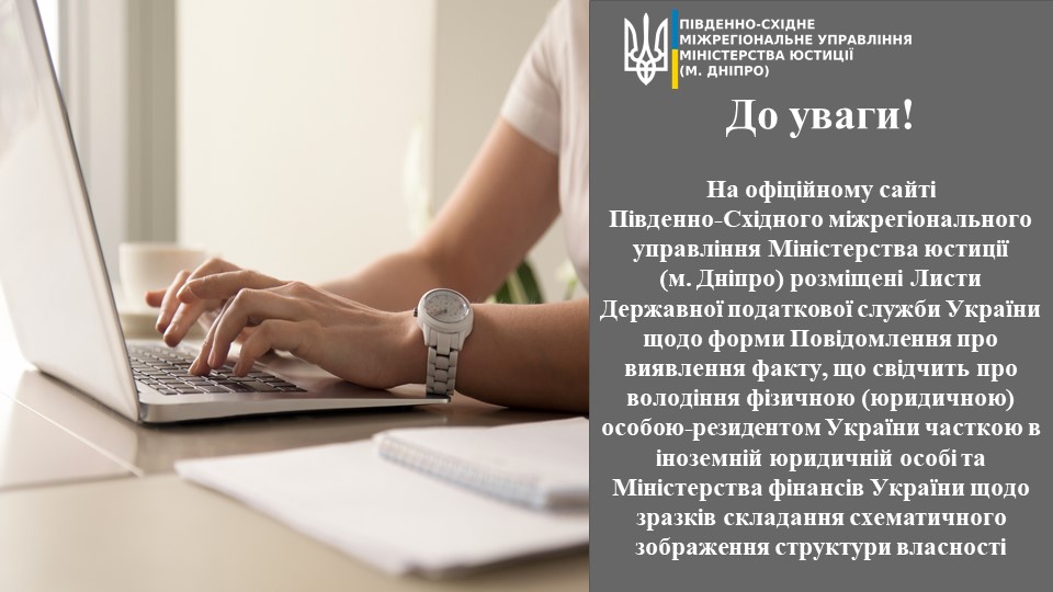 ? Інформуємо, що на офіційному сайті Південно-Східного міжрегіонального управління Міністерства юстиції (м. Дніпро) розміщені Листи Державної податкової служби України від 22.12.2021 вих. №17907/5/99-00-18-04-04-05 щодо форми Повідомлення про виявлення факту, що свідчить про володіння фізичною (юридичною) особою-резидентом України часткою в іноземній юридичній особі та Міністерства фінансів України від 04 січня 2022 року вих. № 26110-03-05/15 щодо зразків складання схематичного зображення структури власності.