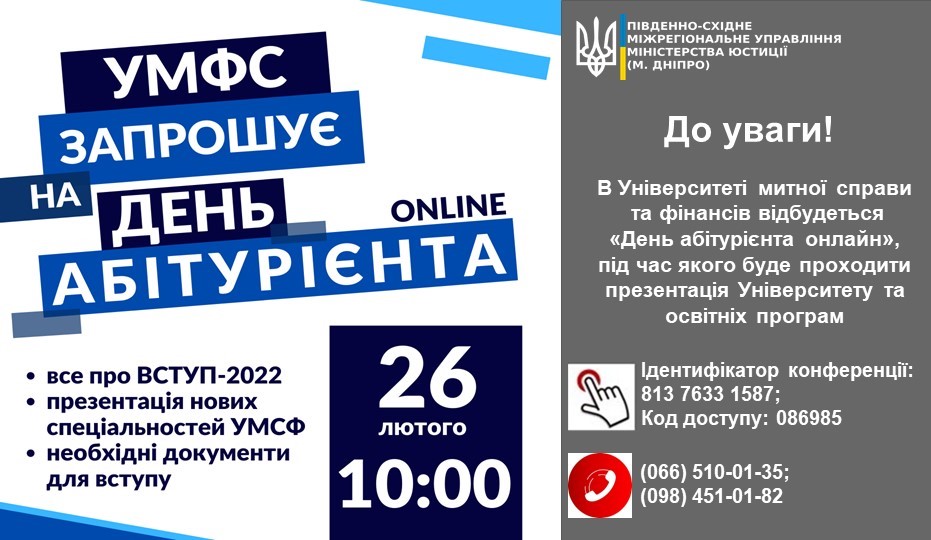 ? 26 лютого 2022 року о 10:00 годині для майбутніх абітурієнтів відбудеться «День абітурієнта онлайн» в Університеті митної справи та фінансів. Зустріч проходитиме у форматі онлайн. На присутніх чекає презентація Університету та освітніх програм. Учасники зустрічі ознайомляться з правилами вступу-2022, переліком предметів ЗНО для спеціальностей та дізнаються про особливості навчання в Університеті.