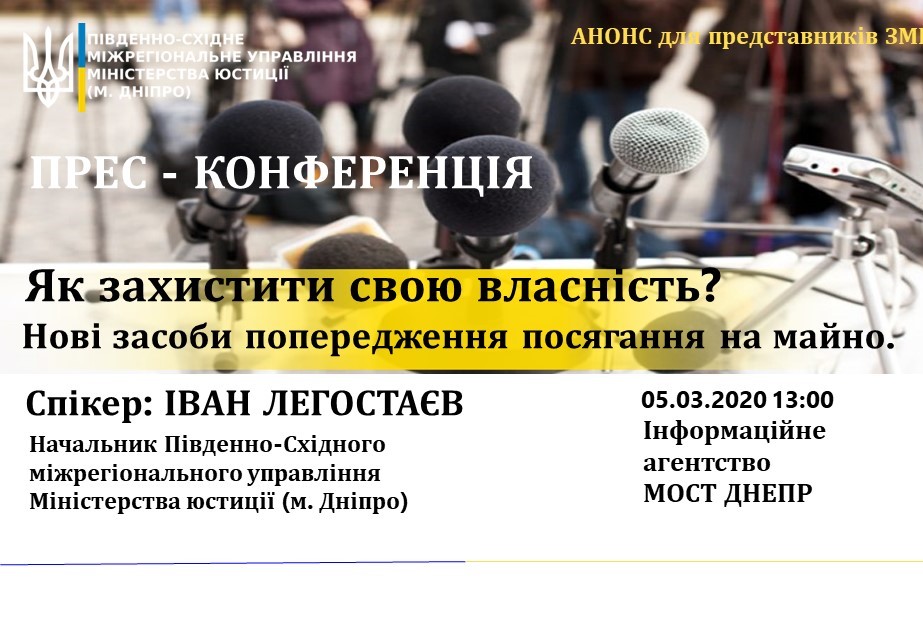 Про інструменти, впроваджені Міністерством юстиції, для запобігання рейдерським захопленням та протиправним реєстраційним діям, завтра, 05.03.2020 о 13.00, під час прес-конференції на базі інформаційного агентства МОСТ-Днепр, розповість керівник Південно-Східного міжрегіонального управління Міністерства юстиції (м. Дніпро) Іван Легостаєв.