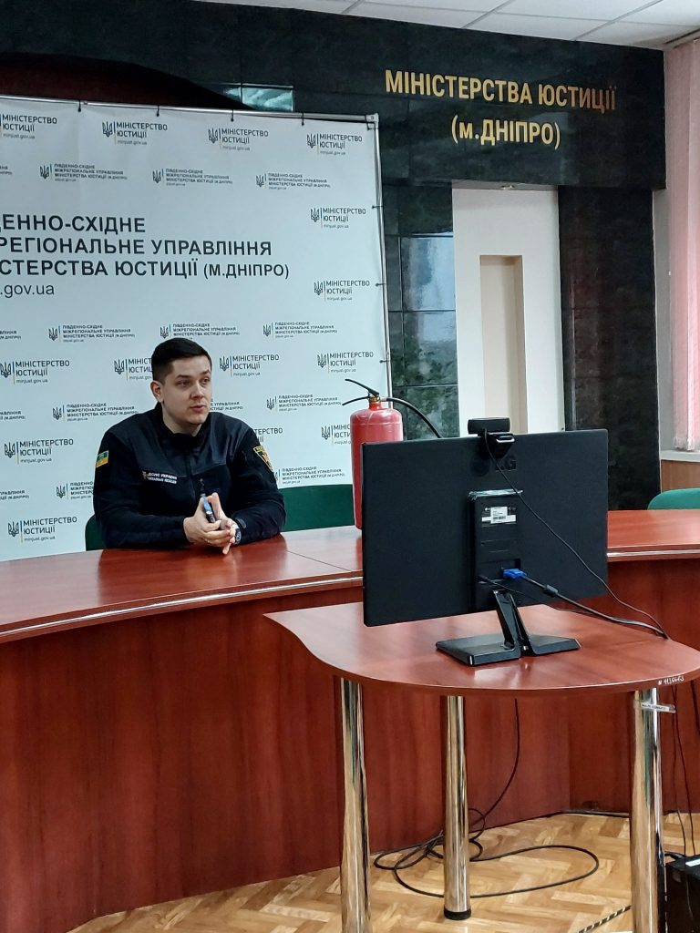 За ініціативи сектору цивільного захисту та охорони праці Південно-Східного міжрегіонального управління Міністерства юстиції (м.Дніпро) 7 грудня 2022 року було проведено навчальний семінар для співробітників, частина з яких долучилася до зустрічі за допомогою відеозв’язку.