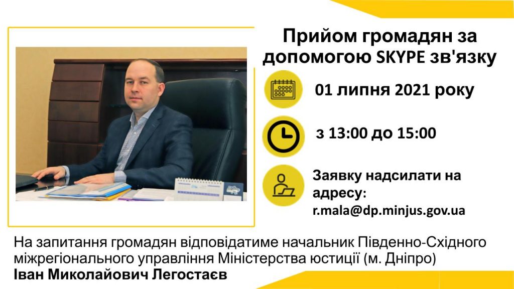 ?01.07.2021 з ⏰ 13:00 до 15:00 відбудеться прийом громадян за допомогою ?? Skype зв`язку начальником Південно-Східного міжрегіонального управління Міністерства юстиції (м. Дніпро) Іваном Легостаєвим.