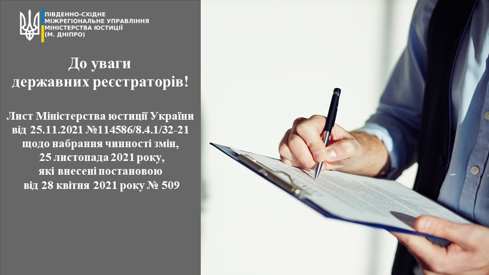 ? У листі Міністерства юстиції України від 25.11.2021 №114586/8.4.1/32-21 щодо набрання чинності змін, 25 листопада 2021 року, які внесені у відповідності до пункту 7 постанови від 28 квітня 2021 року № 509.