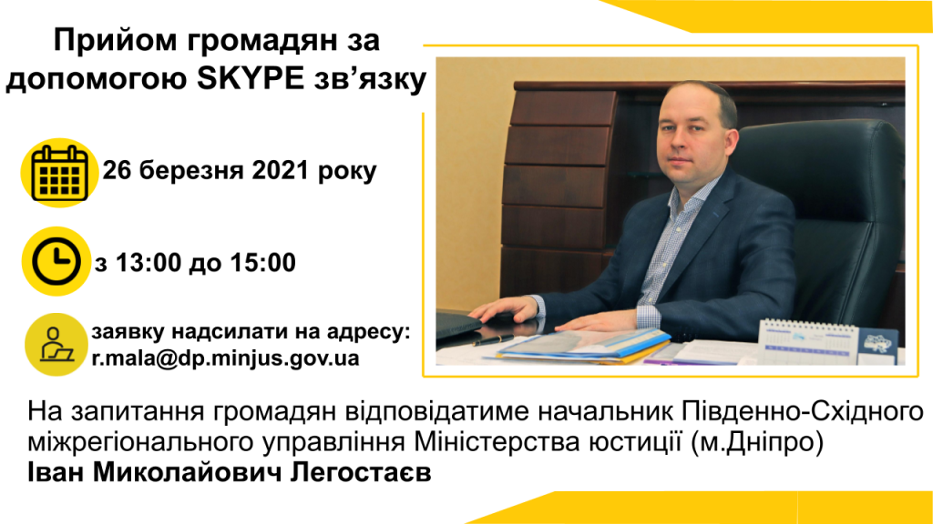 ? 26.03.2021 з ⏰ 13:00 до 15:00 відбудеться прийом громадян за допомогою ?? Skype зв`язку начальником Південно-Східного міжрегіонального управління Міністерства юстиції (м. Дніпро) Ivan Lehostaiev.