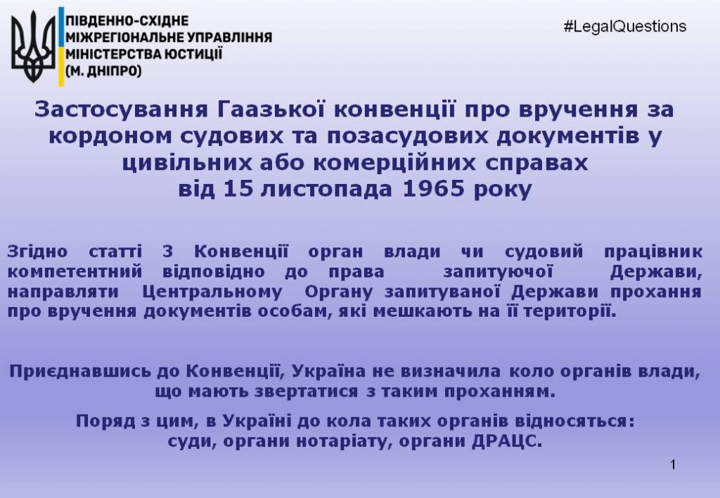 ?Сьогодні у рубриці #LegalQuestions розповідаємо про застосування Гаазької конвенції про вручення за кордоном судових та позасудових документів у цивільних або комерційних справах від 15 листопада 1965 року