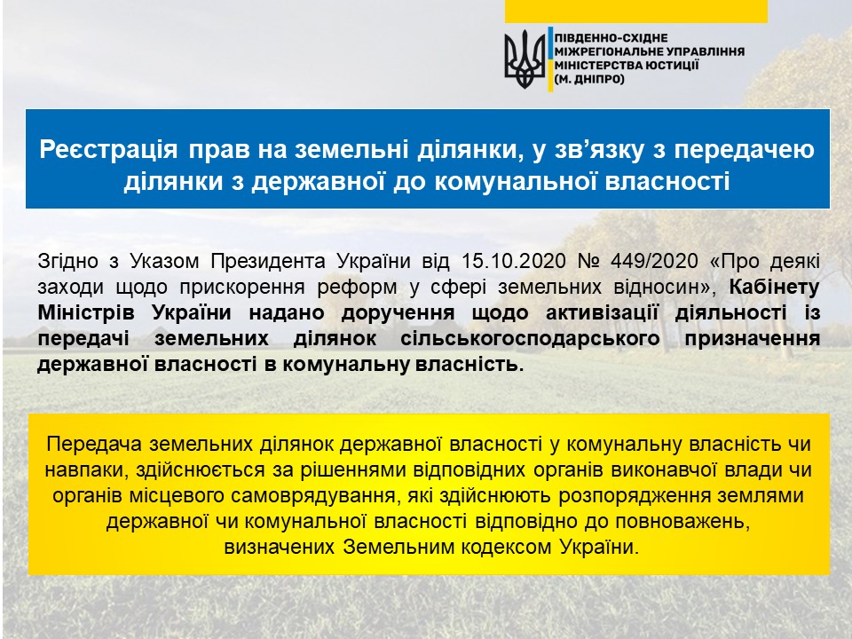 ℹ️В нашій правовій рубриці ? #LegalQuestions сьогодні роз’яснюємо основні аспекти реєстрації прав на земельні ділянки, у зв’язку з передачею ділянки з державної до комунальної власності?
